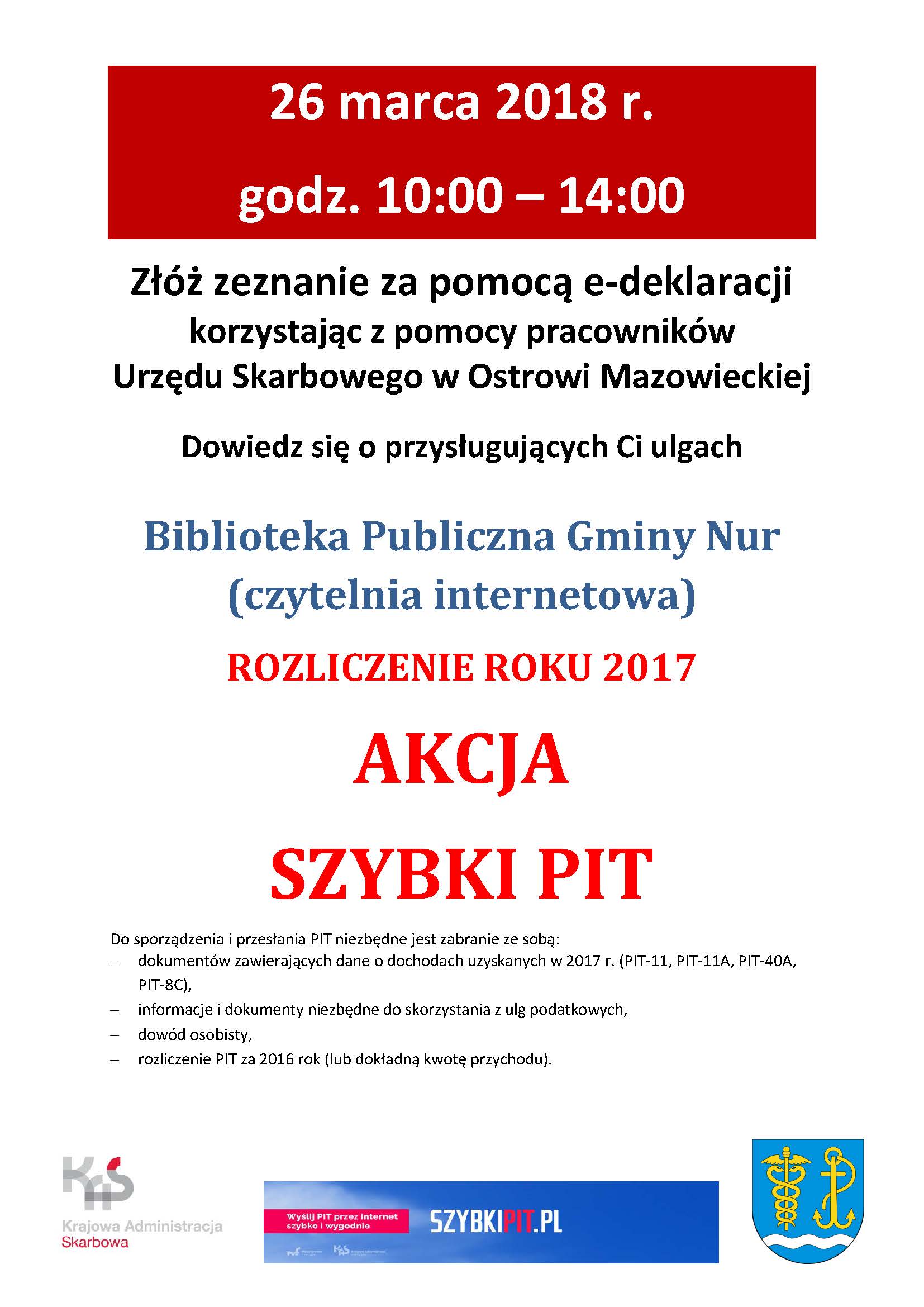 26 marca 2018 r. (poniedziałek) w godzinach od 10:00 do 14:00 w czytelni internetowej Biblioteki Publicznej Gminy Nur, korzystając z pomocy pracownika Urzędu Skarbowego w Ostrowi Mazowieckiej, będzie można złożyć zeznanie za pomocą e-deklaracji.