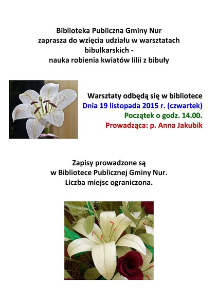 Biblioteka Publiczna Gminy Nur zaprasza zainteresowanych na piąte już w tym roku warsztaty bibułkarskie. Poprowadzi je Pani Anna Jakubik z Zuzeli. Szczegóły na plakacie obok.