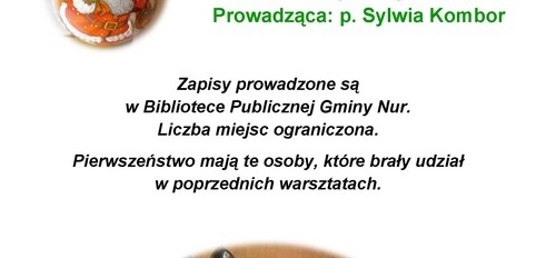 Biblioteka Publiczna Gminy Nur zaprasza chętnych do wzięcia udziału w czwartych już warsztatach decoupage'u. Uczestnicy warsztatów tym razem wykonają bombki choinkowe, stosując technikę serwetkową. Warsztaty te odbędą się w bibliotece w dniu 5 grudnia 2013 r. (czwartek). Początek zajęć...